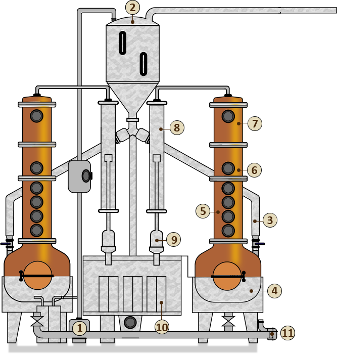 La destilación múltiple produce un destilado (70-75%), que debe diluirse antes del embotellado.